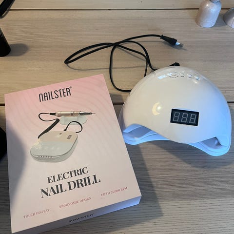 • Trådløs UV/LED-lampe (Power-merke): En profesjonell lampe med innebygd batteri (Battery Capacity indikator). Denne er svært praktisk da man kan jobbe uten ledning. Den har timer-funksjoner (10s, 30s, 60s) og "low heat mode".