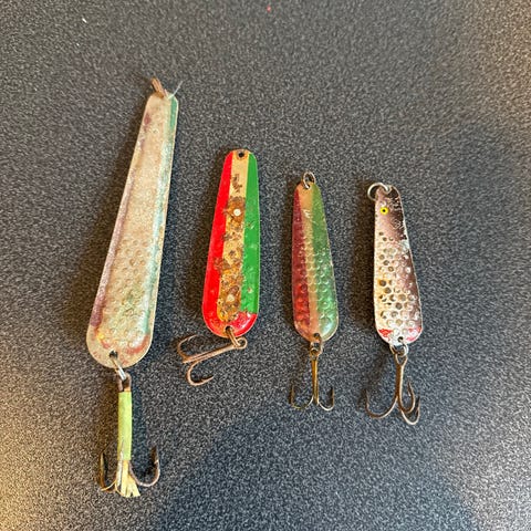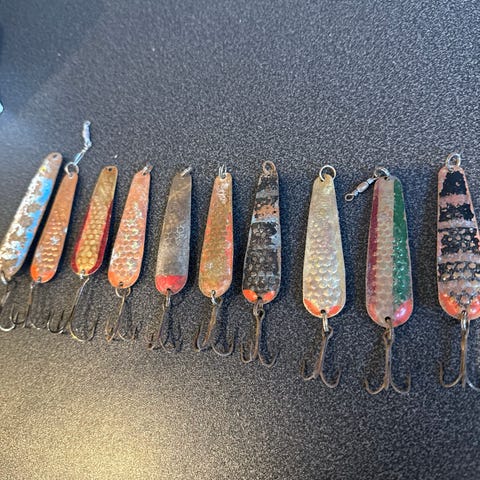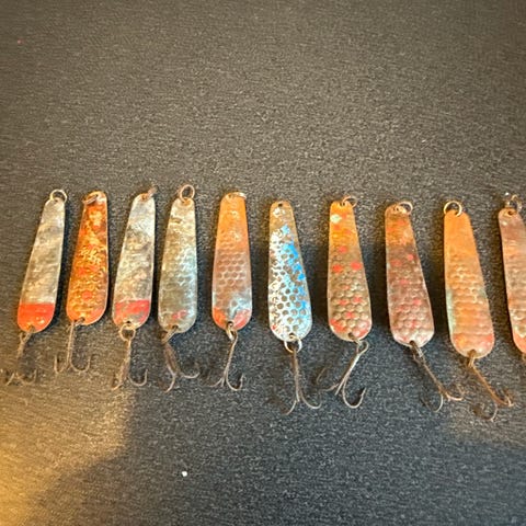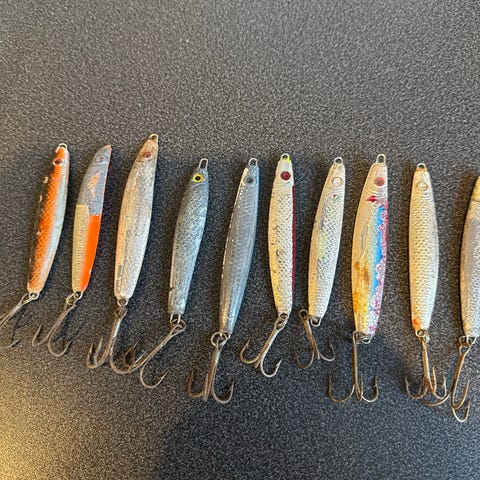 Elbu Torsken sluker i metall, flere eksemplarer i ulike flerfargede mønstre med pregede prikker. Utstyrt med treblekroker. Egnet som sluk til fiske etter torsk og annen sjøfisk. Flere av slukene har synlige bruksspor og noe slitasje på overflate og krok.