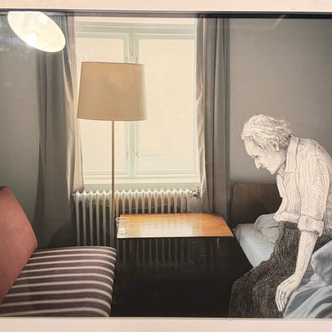 Lena Cronqvist kunsttrykk med figurativt motiv. Bildet viser en stående person i gråtoner med en annen figur i rødt bak, som holder hendene over hodet til personen foran. Fargene domineres av rødt, grått, hvitt og blågrønt. Trykket er rektangulært i stående format og er egnet for innramming og oppheng på vegg i for eksempel stue, gang eller kontor.