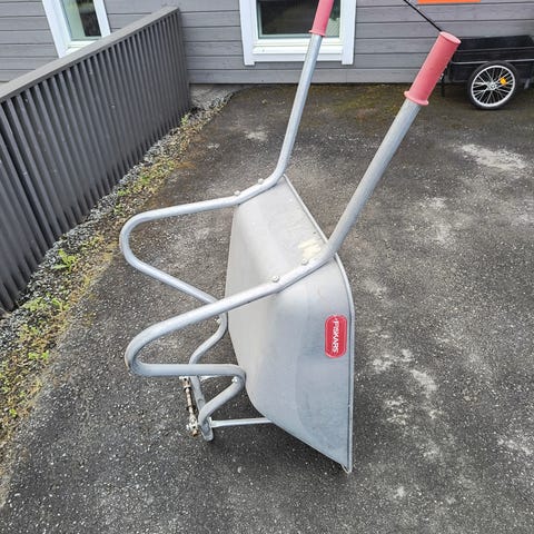 Fiskars Hagebår Plus trillebår i metall. Trillebåren har galvanisert stålkasse. Må ha nytt hjul, selges derfor gunstig. Nypris i dag 1299,-