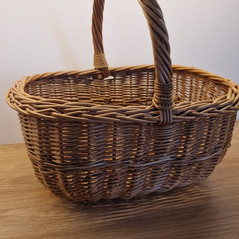 Kurv i flettet rotting med hank i brun farge. Kurven har solid bærehank og åpen topp. Egnet til oppbevaring av for eksempel tepper, leker, ved eller andre husholdningsartikler. Passer til bruk i stue, gang eller andre rom der det er behov for praktisk oppbevaring.