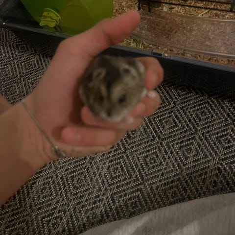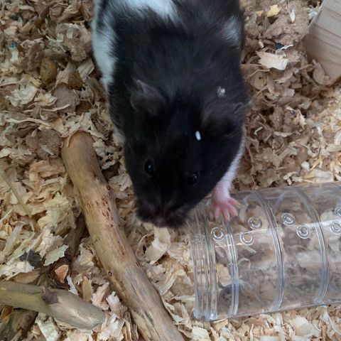 Gullhamster (jente, ca 1 år gammel) selges med bur og tilbehør. Veldig stor og fin :)