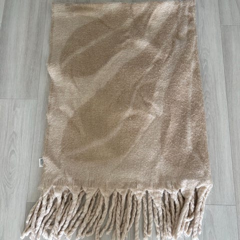 Et mykt pledd med innslag av ull og med frynser langs kortsidene.