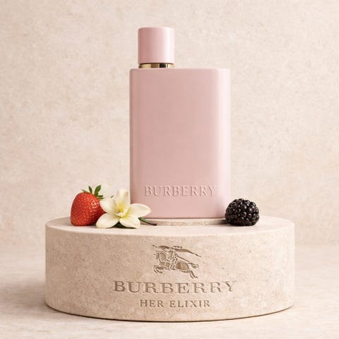 Burberry Her Parfum er en fruktig, men samtidig dyp, gourmandduft. Det er den mest intense duften i Burberry Her-familien – dristig og sofistikert. Burberry Her er selve essensen av frihet: spenningen ved åpen himmel, gleden av å uttrykke seg selv, styrken i å gå sin egen vei. En duft like banebrytende som kvinnen som bærer den. Den åpner med delikate noter av kirsebær, som utvikler seg til et varmt hjerte av amber og videre til en elegant, omsluttende base av vanilje – kompleks og full av kontraster. Den ikoniske Burberry Her-flasken har fått en dyp rosa farge med matt finish, og emballasjen er oppdatert med flere bånd i samme rosanyanse, noe som understreker duftens intensitet og dristighet.