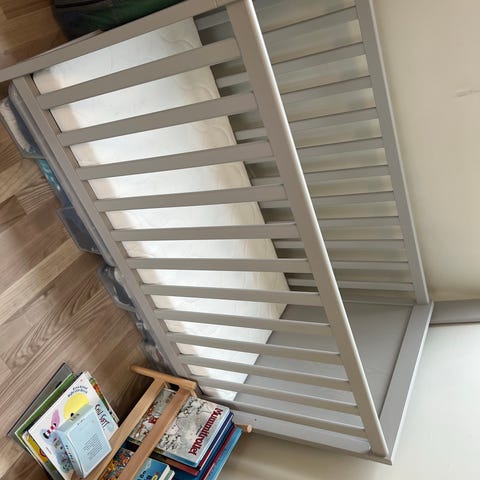 Mormor selger sprinkelsengen med madrass, madrassbeskytter, sprinkelbeskytter og laken.
