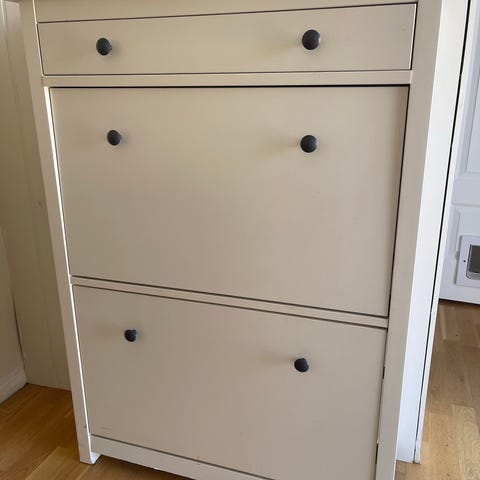 Selger et pent brukt HEMNES skoskap fra IKEA i hvit farge. Skapet har runde metallknotter i messingfarge og et klassisk design som passer fint i gangen.