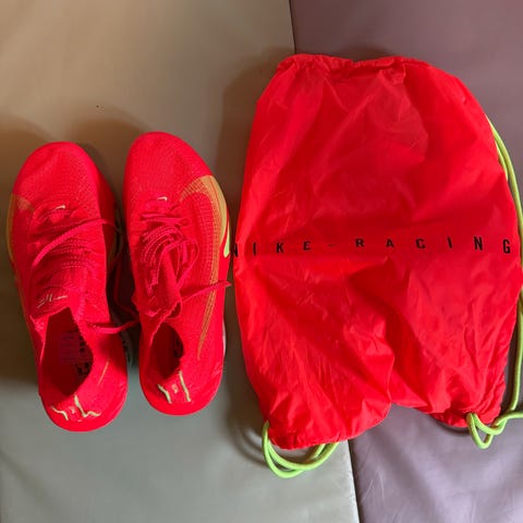 Modellen har overdel i Flyweave-materiale i rosa med snøring foran. Yttersålen er oransje og er utstyrt med flere utskiftbare pigger til bruk på bane. Skoene leveres sammen med Nike-trekkpose og utepigger/nøkkel slik det vises på bildene.