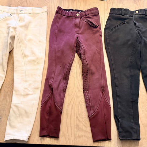 Sett med barneklær fra ukjent merke. Inneholder en rosa genser med enhjørningmotiv, en lys rosa t-skjorte med hestemotiv og et par grå ridebukser med forsterkede felt på innsiden av bena. Klærne passer til barn og har hestetema som går igjen i alle plaggene. Egnet til hverdagsbruk og ridning/aktiviteter der ridebuksen kan brukes. Mye er kjøpt på horze, noe er kjøpt på Ullared. Meste er horze sine produkter.
