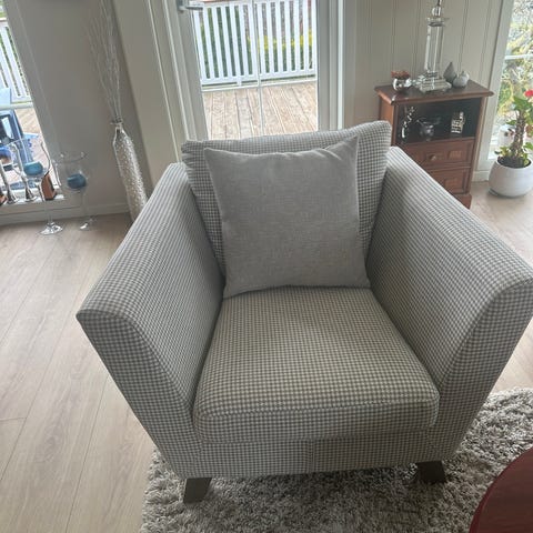 Godt brukt stol gis bort mot henting. Følger med en puff. Trekke kan taes av å vaskes. Ellers er stolen i god stand