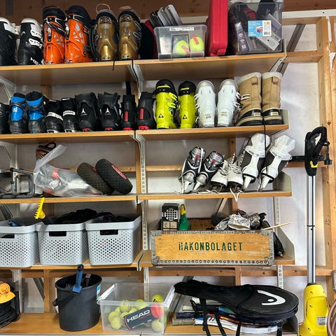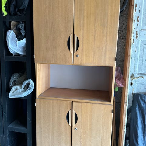 Hyllesystem med skinner til veggmontering. Høyden på den ene er 200 cm, den har også føtter til å stå på. Den andre er 150 cm høy, monteres på vegg og passer fint over et skrivebord. To skinner på 100 cm hver på toppen. 8 hylleplater, 80 cm breie og 30 cm dype, kan monteres på forskjellige høyder og avstander.