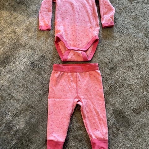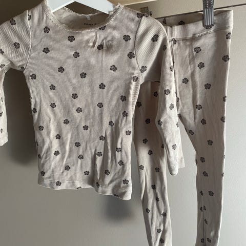 Name it sett med genser og leggings til jente i størrelse 92. Sett i rosa bomull med små blomsterdetaljer. Langermet genser med rund hals og matchende leggings i samme mønster🌸