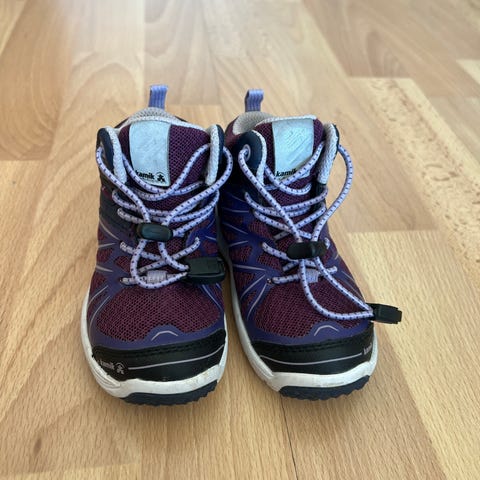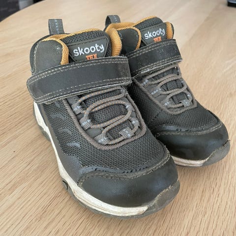 Vårsko til barn i størrelse 24. Brukt av 1 barn. Med Goretex, men sikkert lurt å impregnere på nytt. Kommer med enkel snøring foran.