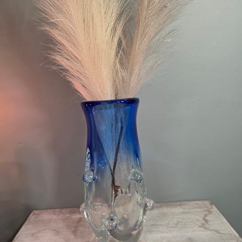 Dekorert med store runde linser/bobler rundt hele vasen.