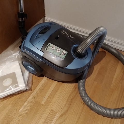 Nilfisk støvsuger i rød og grå farge. Modellen har slange, teleskoprør og gulvmunnstykke, samt regulering på selve enheten. Passer til rengjøring av gulv og tepper i hjemmet. Mangler et tilbehør men ellers fungerer som den skal.