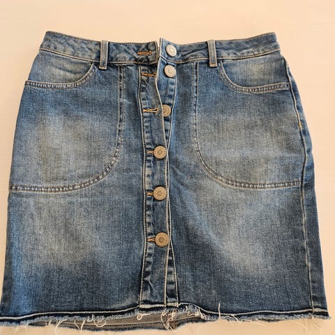 Forever 21 olaskjørt i denim for dame i størrelse S. Skjørtet er blått og laget i denimstoff. Det har knappelukking hele veien ned foran med metallknapper, to brystlommer med klaff og knapp foran samt to baklommer. Nederkanten har rå kant med frynser. Passer som et hverdagsplagg eller til en enkel, casual stil.