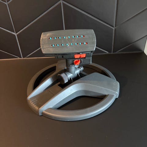 Gardena hagepistol i oransje og grå plast. Pistolen har ergonomisk håndtak med sklisikkert grep og avtrekker på oversiden for regulering av vannmengde. Foran sitter et rundt munnstykke med justerbar stråle, egnet til vanning av blomsterbed, plen og krukker. Bak har pistolen standard Gardena-hurtigkobling for tilkobling til hageslange og øvrig Gardena-utstyr.