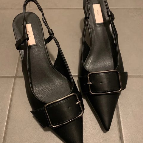 Nelly hæler for dame i størrelse 40. Skoene er svarte med spiss tå og middels høy hæl. Modellen har åpen hæl med justerbar rem rundt ankelen og dekorative remmer over vristen. Passer til bruk ved formelle anledninger, jobb eller hverdagsbruk der man ønsker et mer pyntet uttrykk.