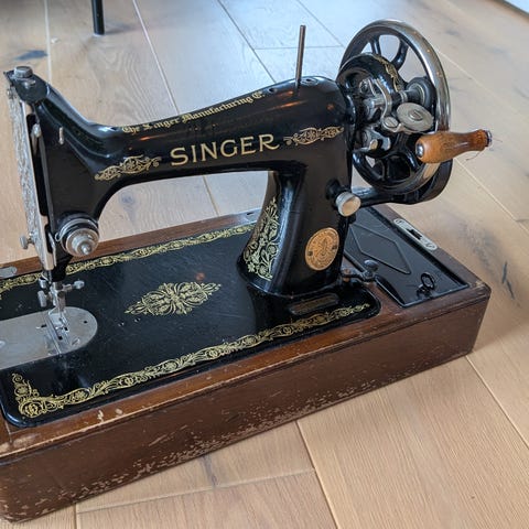 Symaskinen, Singer 422 fri arm symaskin, fungerer helt fint. Den ble senest brukt i sommer til å reparere båtputer. Bruksanvisning følger med.