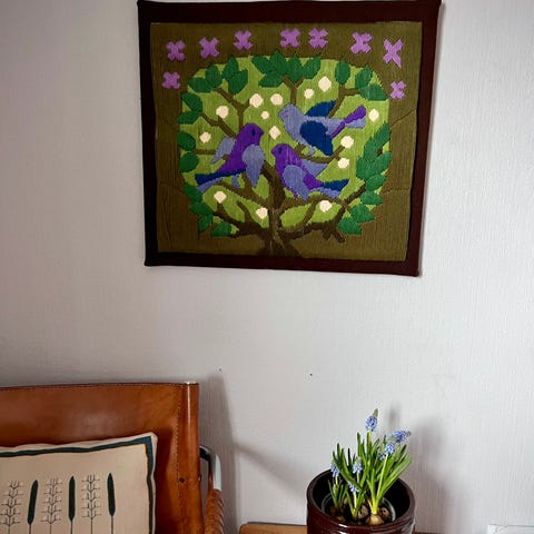 Dette er et unikt håndarbeid som gir en varm og nostalgisk stemning i rommet, og kan også være interessant for samlere av retro interiør eller vintage håndarbeid.