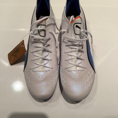 Puma Ultra fotballsko i størrelse 38,5 (UK 5,5 / US 6,5 / 24,5 cm). Modellen er tilpasset spill på gress med faste knotter under sålen. Skoene har overdel i syntetisk materiale med hvit og rosa fargekombinasjon samt Puma-logo på siden og hælen. Snøring i front for justerbar passform. Egnet som fotballsko til trening og kamp på naturgressbaner.