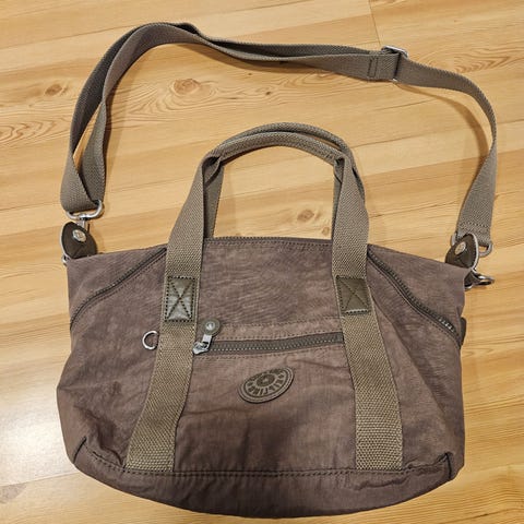 Stødig, liten skulderveske selges. Khakigrønn på utsida, rosa inni. Har en del nyttige lommer.