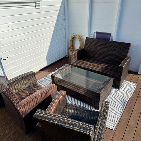 Hagegruppe i brun kunstrotting bestående av to stoler, en sofa og et bord. Møblene er beregnet for utendørs bruk på terrasse, balkong eller hage. Settene har armlener og ryggstøtte for sittekomfort. Bordet har glassplate på toppen. Passer som sittegruppe i uteområdet der det er behov for flere sitteplasser.