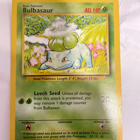 Dette er et klassisk kort fra den originale Base Set-utgivelsen fra 1999. Bulbasaur er en av de ikoniske starter-Pokémon fra første generasjon og et kort mange husker fra de tidlige Pokémon-årene.