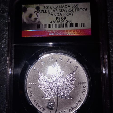 Forsiden viser motiv med to pandaer og bambus. Mynten er innkapslet og gradert av NGC med betegnelse PF 69 Ultra Cameo.