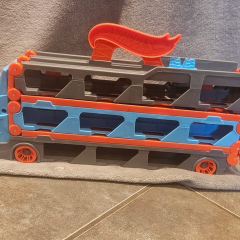 Hot Wheels Monster Jam lekebil lastebil med tilhenger i blå plast. Lastebilen har dekor med Monster Jam-motiv på sidene av tilhengeren. Tilhengeren kan åpnes fra siden og gir plass til oppbevaring eller lek med mindre biler eller figurer. Egnet som lekekjøretøy for barn som liker lastebiler og monstertrucker.