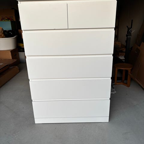 Malm kommode fra IKEA med 6 skuffer. Dessverre en sprekk i mellomstykket, det synes på bildet. Funker som den skal.