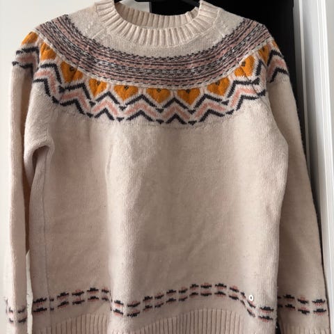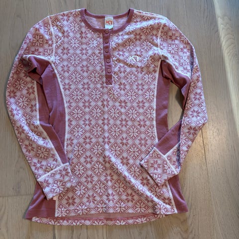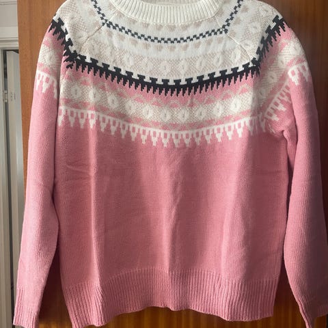 Genseren er gammelrosa med flerfarget mønster rundt bærestykket og nederst på bol og ermer. Rett passform.