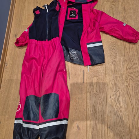 Regnsett fra Didricksons. Ingen hull men normal slitasje. Har prøvd å unngå å vaske det i maskinen for mye for å skåne plaggene, derfor litt "møkkete". 🌸