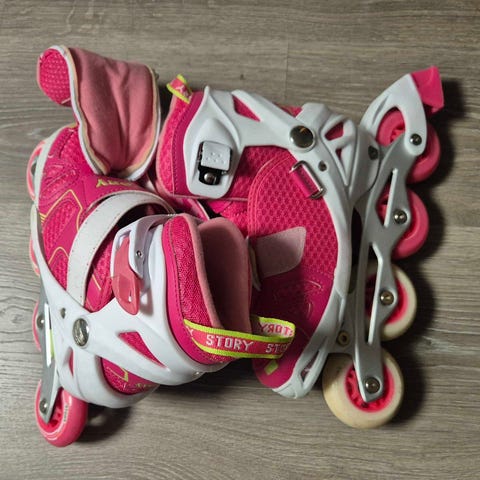 Rulleskøyter for barn i størrelse 36. Modellen har justerbare spenner og hjul egnet for bruk på asfalt og jevne underlag. Fargen er lys med kontrastdetaljer.