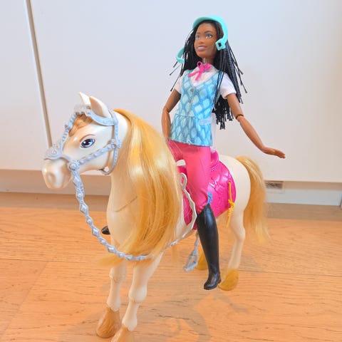 Barbie lekesett med dukke, hest og tilbehør. Settet inneholder en Barbie-dukke med ridetøy og hjelm, hest med sal og hodelag, samt flere små deler som møbler, huskestativ med dekkhuske, dyr og diverse småting til lek.