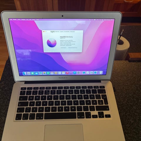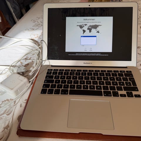 Apple MacBook bærbar PC i sølvfarget aluminium. Maskinen har bakbelyst tastatur, stor styreflate og skjerm i widescreen-format. Kabinettet er i metall med Apple-logo på lokket. Undersiden har gummiføtter for stabilitet på bordflate. Strømadapter medfølger, som vist på bildene. Egnet til generell kontorbruk, studier og enkel multimedia-bruk, avhengig av maskinens interne spesifikasjoner som ikke er oppgitt her.