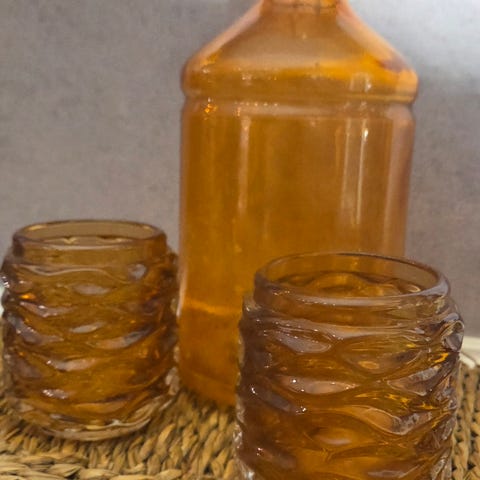 Koselig, vintage sett i lekkert ravfarget glass med kurver.