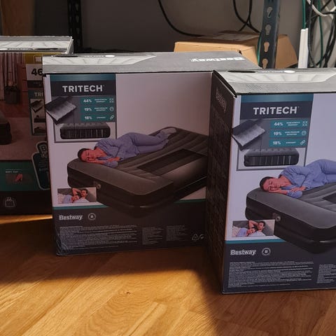 Strømtilkobling skjer via vanlig stikkontakt. Ventil for manuell lufting er også integrert i siden av madrassen. Eventuelt sengetøy, puter og dyner som vises på bildene kan være inkludert eller utelatt etter avtale med selger.
