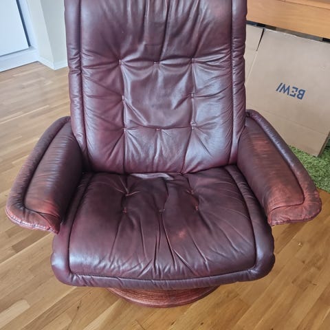 Selger samlet 2 stk lekre grå lenestol i ull med tilhørende puff. Veldig gode å sitte i.