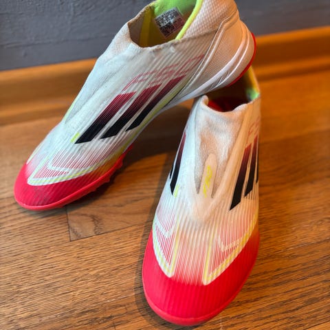 Adidas X fotballsko i hvit og rød farge med gule detaljer. Lissesløs overdel med de karakteristiske tre stripene på sidene. Knotter tilpasset bruk på gressbane. Overdelen er i syntetisk materiale og skoene har hempe bak for enklere av- og påtaking. Størrelse 31.