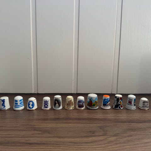 Fin og variert samling med fingerbøl i porselen, metall og keramikk. Flere har dekorative motiver som flagg, figurer, bymotiv og ulike mønstre. Noen kommer også i små utstillingsbokser.
