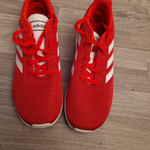Adidas sneakers joggesko i størrelse 41. Skoene har svart overdel med røde detaljer og svart yttersåle med mønster for godt grep.