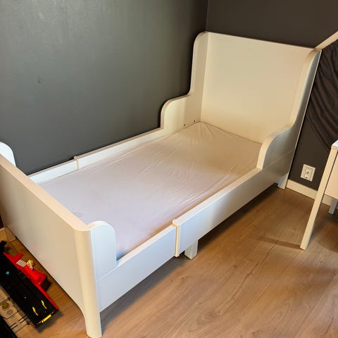 Pent brukt IKEA Busunge vokseseng i hvit. Sengen kan justeres i lengden etter behov, som vist på måleillustrasjonen.
