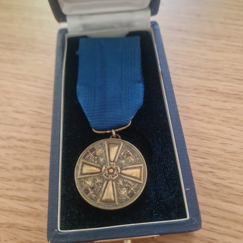 Selger et pent eksemplar av en finsk medalje med opprinnelig medaljebånd.