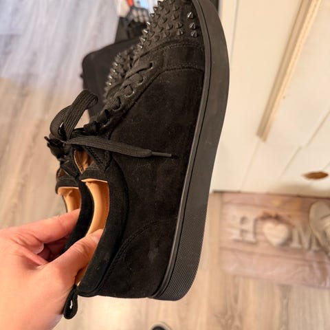Christian Louboutin sneakers/joggesko i størrelse 37. Modellen er lave sneakers i svart farge med karakteristisk rød såle. Overdelen har snøring og dekorative nagler i front. Innside i lyst skinn. Leveres med original eske og tilbehør som vist på bildene. Egnet som fritidssko eller til mer pyntede antrekk der man ønsker et par markerte sneakers. Brukt 2-3 ganger har en til par derfor vil selge den.