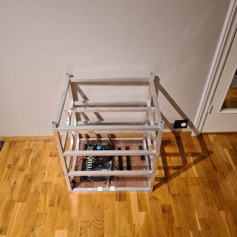 Selger en Mining ramme grunnet slutt av mining, funker enda helt fint. Passer 12x GPU, et hovedkort og 2x ATX strømforsyninger. Er komplett med skruer. Riser følger ikkje med.