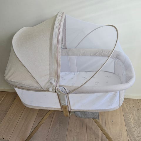 Pent brukt og uten synlige bruksmerker eller flekker. Denne vuggen er velegnet til en nyfødt baby. Sammenleggbar, deksel, madrass og overmadrass følger med. Kan brukes som reiseseng. Har innbygd myggnett. Kan stå fast eller gynge.