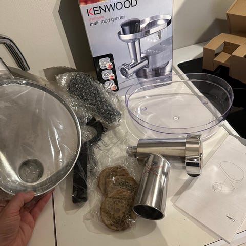 Kenwood multi food grinder/Kjøttkvernen brukes til maling av kjøtt, fisk og andre matvarer. Pakken inneholder kvernhus, mateskål, mater, skrue og flere hullskiver for ulik grovhet på kverningen. Alle deler som er i kontakt med mat er av metall og plast beregnet for matvarer. Egnet til vanlig bruk på kjøkkenet for tilberedning av farse, kjøttdeig og lignende. Aldri brukt.
