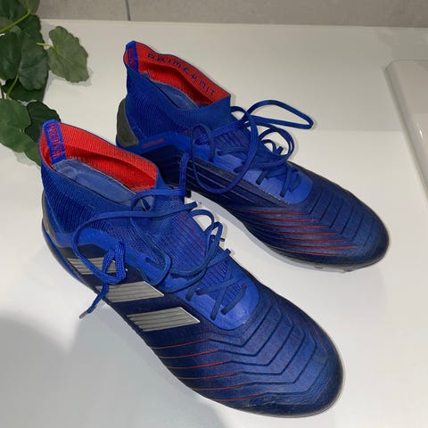 Svært lite brukt da de ble for små. Str 43 1/3. Adidas fotballsko for faste gressbaner (FG). Skoene har overdel i syntetisk materiale med snøring foran. Yttersålen har faste knotter tilpasset spill på naturgress. Fargekombinasjon med røde og lyse detaljer samt kontrastfargede striper på siden. Egnet til fotballspill på faste underlag.