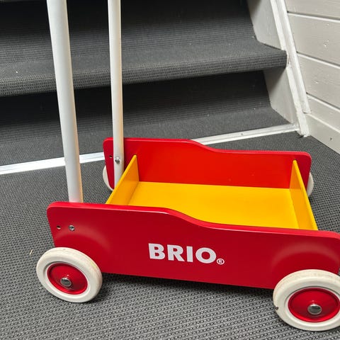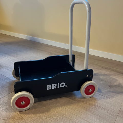 Tradisjonell gåvogn fra BRIO, brukt til ett barn kun innendørs. Den har noen merker, se bilder. Men ellers i god stand og fremstår pen og lite brukt.