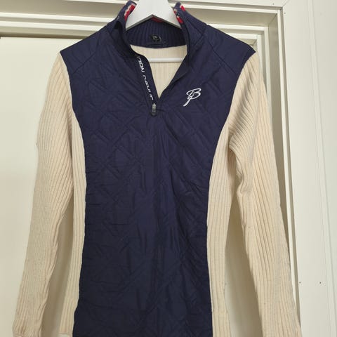 Björn Borg genser for dame i størrelse M. Genseren er i bomull og har blå front med vattert felt og glidelås i halsen, samt lyse ermer og bakside i ribbestrikket materiale. Egner seg til hverdagsbruk og lett fritidsbruk.